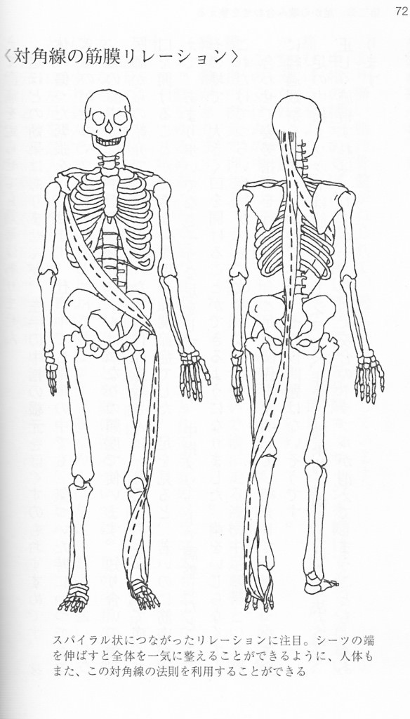 人間の身体はらせん状に、筋膜によって連動している。足裏のツボの反射区などで、左足は右上半身のそれぞれ対応しているのは、この筋膜が対角線状にリレーションしているという人体構造からくるものなのです。